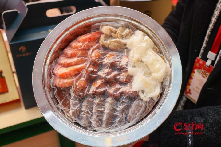 “这是广东过年时家家户户都吃的大盆菜,有鲍鱼、海参、扇贝、花胶、大虾……每样都是有吉祥寓意的优质食材。”大厨何海晖现场烹饪广东十大名菜之一大盆菜,并为市民做详细介绍,“这款产品只需要买回家放在电磁炉上加热后就能食用,非常方便,既符合现代人的生活节奏,又能带来浓浓的年味。”